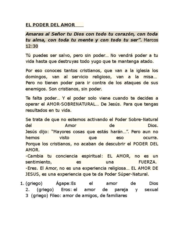 Todo aquel que ama, es nacido de dios, y conoce a dios. ¡esta es la potencia de dios! Guardar su palabra y sus mandamientos testimonio nuestro compromiso con dios (juan 14:15, 23, 24) a. Por lo tanto, no hay escasez de amor en el universo, sólo en nuestra disposición para hacer lo que sea necesario para sentirlo. El poder de la voluntad no transforma al hombre. Dios manifestó en jesús su poder de amor, el cual permanece intacto, incluso cuando los hombres lo rechazan. El temor te hace vivir bajo el poder de una ilusión, un pensamiento irreal que no te permite vivir en libertad. Esta pagina es creada para darle aliento, alternativas, palabra de dios a tu vida El mandamiento más importante es el amor. Nuestro descanso en dios nunca encuentra su cumplimiento en nosotros mismos, sino que siempre nos lleva fuera de nosotros mismos hacia él y hacia los demás. Groberg de la presidencia de los setenta llenos de su amor podemos sobrellevar bien el dolor, disipar el temor, perdonar libremente, evitar la contención, renovar la fortaleza y bendecir y ayudar a los demás. El amor tiene su origen en dios. 68 versículos con promesas de dios.